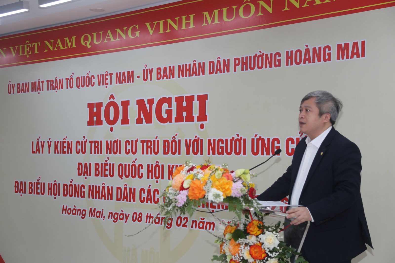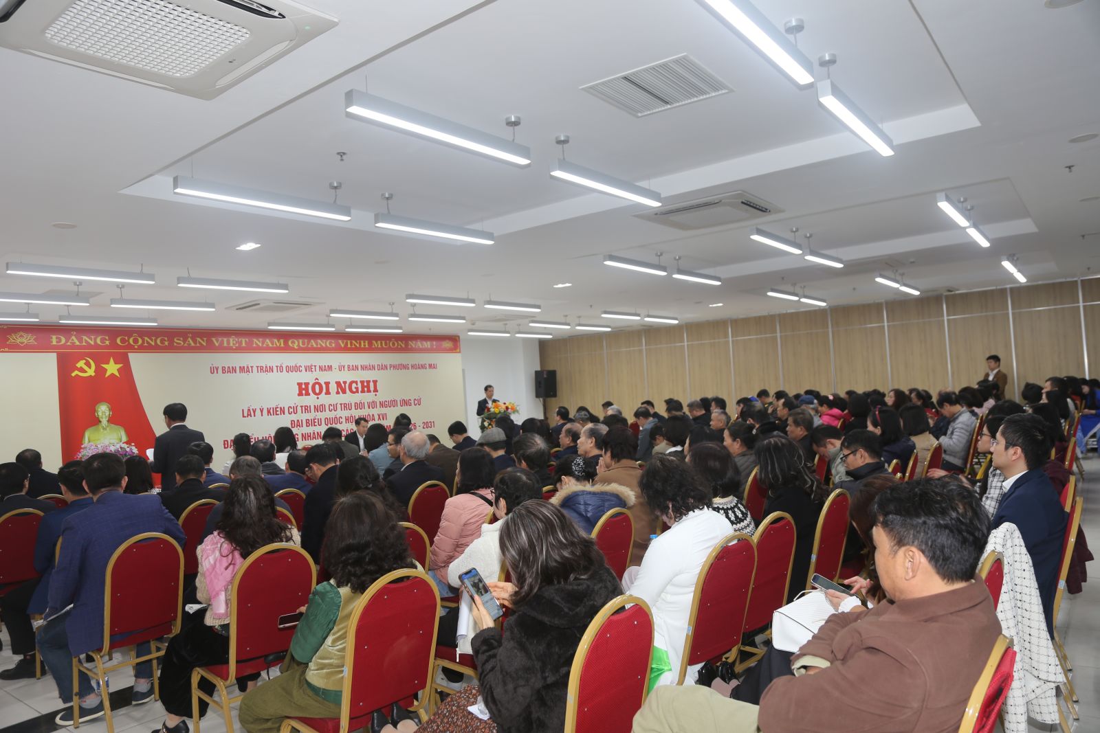 Tại Hội nghị, cử tri phường Hoàng Mai đã nghe giới thiệu các tiêu chuẩn của người ứng cử đại biểu Quốc hội Khóa XVI và tóm tắt tiểu sử người ứng cử hiện đang cư trú trên địa bàn phường là đồng chí Trần Sỹ Thanh, Ủy viên Bộ Chính trị, Bí thư Trung ương Đảng, Chủ nhiệm Ủy ban Kiểm tra Trung ương; các ý kiến cử tri thống nhất đánh giá, đồng chí Trần Sỹ Thanh đáp ứng đầy đủ tiêu chuẩn ứng cử đại biểu Quốc hội khóa XVI.