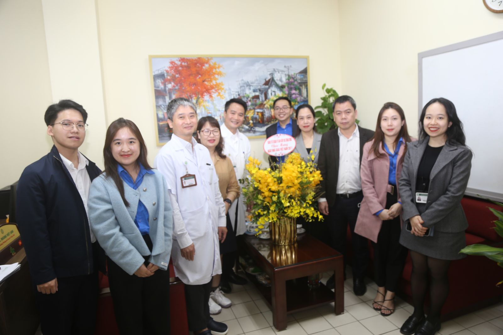 Đồng chí Nguyễn Thùy Dương và các cán bộ trong đoàn công tác tặng hoa chúc mừng các thầy/cô tại Bệnh viện Bạch Mai