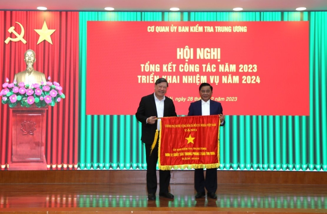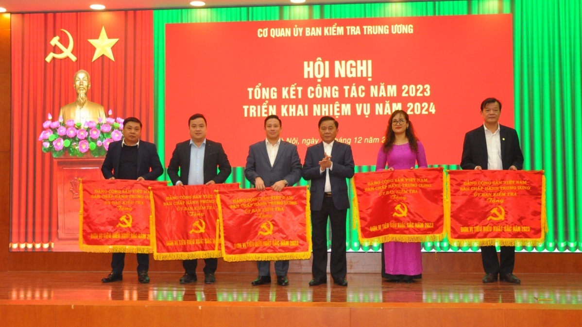 Đồng chí Trần Cẩm Tú, Ủy viên Bộ Chính trị, Bí thư Trung ương Đảng, Chủ nhiệm UBKT Trung ương trao Cờ thi đua của UBKT Trung ương tặng 5 tập thể đạt thành tích xuất sắc trong năm 2023.