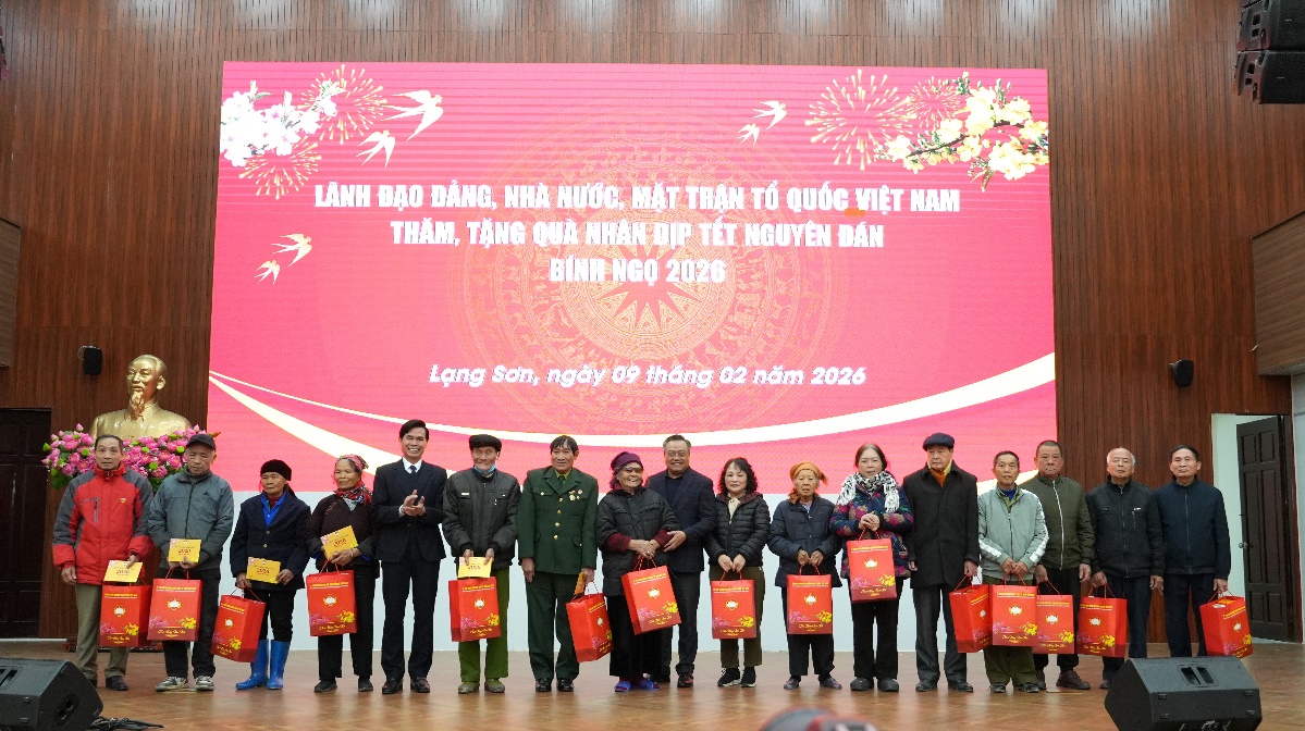 Nhân dịp Tết Nguyên đán Bính Ngọ 2026, toàn tỉnh Lạng Sơn đã trao hơn 15.000 suất quà cho người có công, thân nhân người có công với tổng kinh phí gần 7,5 tỷ đồng. Cùng với đó, tỉnh tập trung nguồn lực chăm lo cho các đối tượng yếu thế, cụ thể, đã hỗ trợ hơn 2.600 suất quà cho hộ nghèo, đối tượng bảo trợ xã hội với kinh phí hơn 1,56 tỷ đồng. Đặc biệt, thông qua Ủy ban Mặt trận Tổ quốc, Hội Chữ thập đỏ, Liên đoàn Lao động tỉnh và các tổ chức chính trị xã hội, toàn tỉnh đã huy động trao tặng hơn 26.000 suất quà tết cho hộ nghèo, cận nghèo, người lao động có hoàn cảnh khó khăn và trẻ em mồ côi, người khuyết tật trên địa bàn tỉnh.
