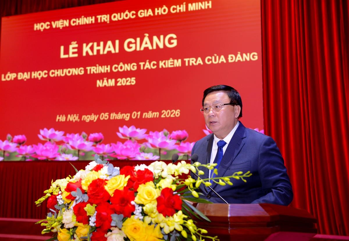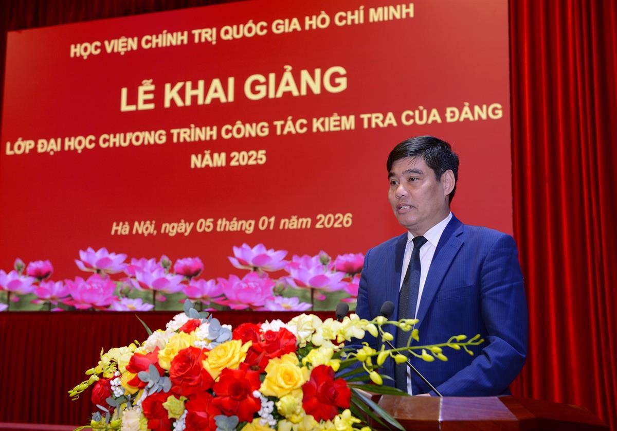 Phát biểu tại Lễ khai giảng, GS,TS Nguyễn Xuân Thắng, Ủy viên Bộ Chính trị, Giám đốc Học viện Chính trị quốc gia Hồ Chí Minh, Chủ tịch Hội đồng Lý luận Trung ương chúc mừng 84 đồng chí học viên tham dự khóa đầu tiên có mặt tại buổi Lễ. Đồng chí nhấn mạnh, thực hiện Quy định số 296-QĐ/TW ngày 30/5/2025 của Bộ Chính trị về công tác kiểm tra, giám sát và kỷ luật của Đảng, Học viện Chính trị quốc gia Hồ Chí Minh đã phối hợp với Ủy ban Kiểm tra Trung ương thành lập Trung tâm Nghiên cứu và Đào tạo, bồi dưỡng công tác kiểm tra của Đảng nhằm đào tạo, bồi dưỡng chuyên sâu về chuyên môn, nghiệp vụ cho đội ngũ cán bộ làm công tác kiểm tra, giám sát của Đảng; góp phần nâng cao chất lượng, hiệu quả công tác kiểm tra, giám sát đối với cán bộ các cấp, nhất là trong điều kiện thực hiện chính quyền địa phương hai cấp.