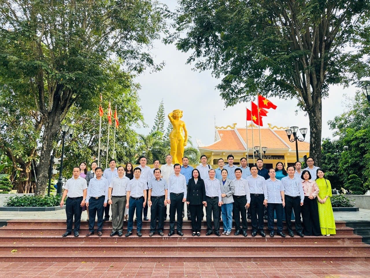 Đoàn chụp ảnh lưu niệm trước tượng đài Anh hùng liệt sĩ Võ Thị Sáu