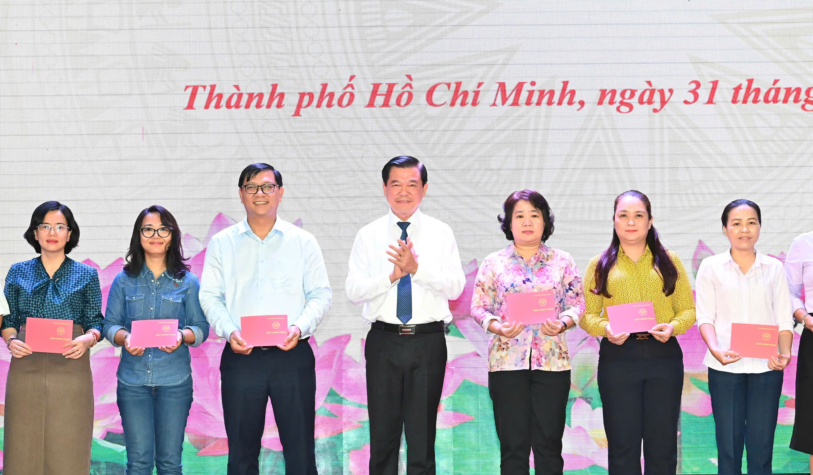 Đồng chí Lê Quốc Phong, Ủy viên Trung ương Đảng, Phó Bí thư Thường trực Thành ủy TPHCM trao giấy chứng nhận bồi dưỡng cho các học viên. Ảnh: VIỆT DŨNG