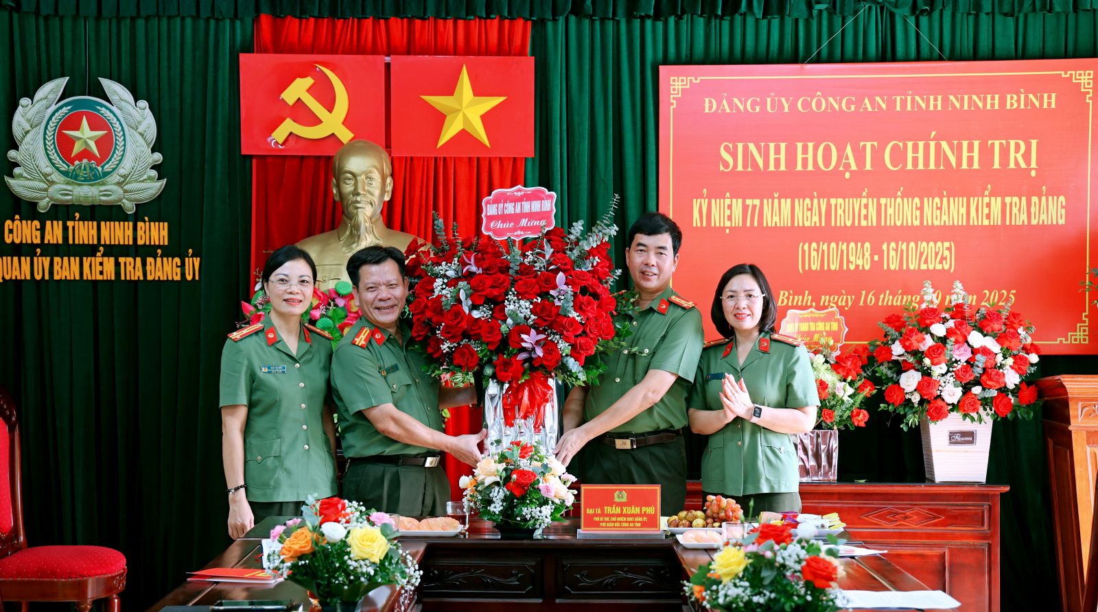 Đồng chí Đại tá Trần Xuân Phú, Phó Bí thư Đảng ủy, Chủ nhiệm Ủy ban Kiểm tra Đảng ủy, Phó Giám đốc Công an tỉnh tặng hoa chúc mừng Ủy ban Kiểm tra Đảng ủy Công an tỉnh.