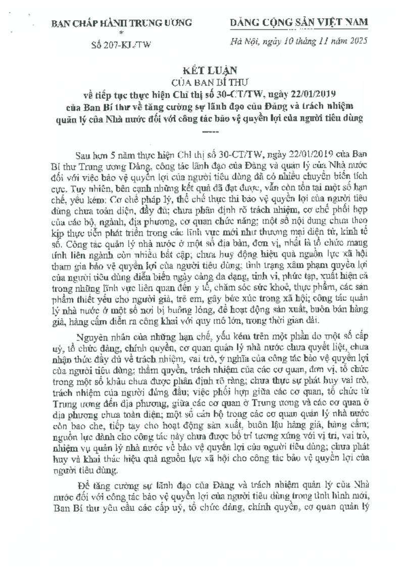 | Tiêu đề văn bản | Kết luận số 207-KL/TW ngày 10/11/2025 của Ban Bí thư về tiếp tục thực hiện Chỉ thị số 30-CT/TW, ngày 22/01/2019 của Ban Bí thư về tăng cường sự lãnh đạo của Đảng và trách nhiệm quản lý của Nhà nước đối với công tác bảo vệ quyền lợi của người tiêu dùng | ||