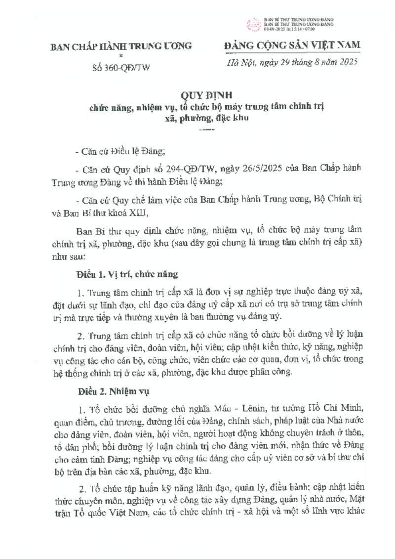 Tiêu đề văn bản | Quy định số 360-QĐ/TW, ngày 29/8/2025 của Ban Bí thư về chức năng, nhiệm vụ, tổ chức bộ máy trung tâm chính trị xã, phường, đặc khu | ||