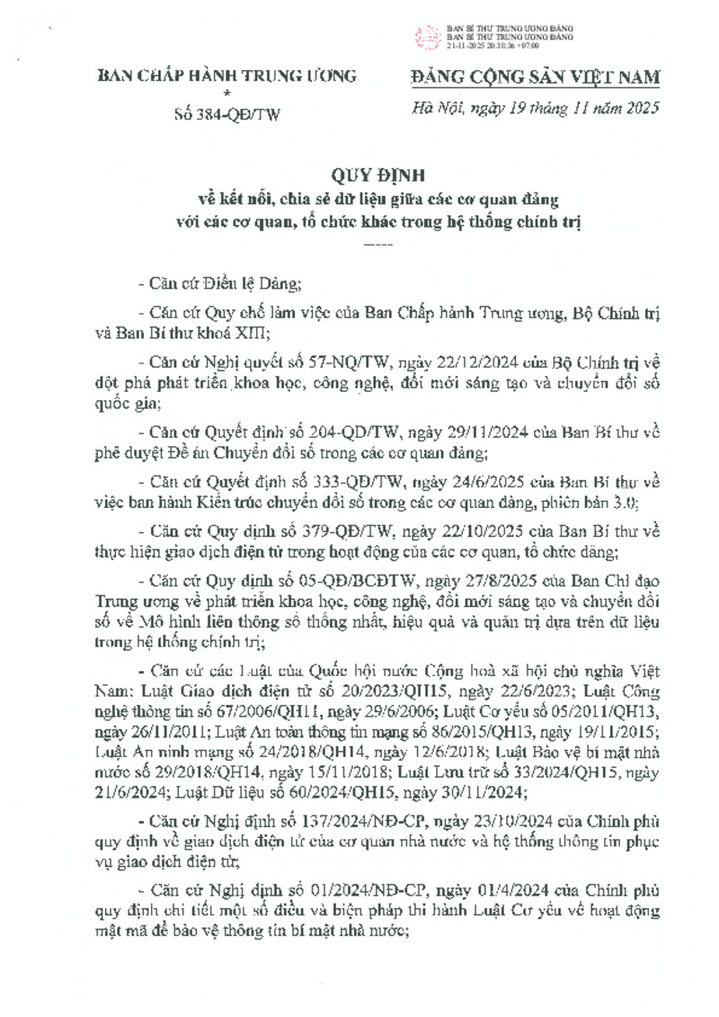 | Tiêu đề văn bản | Quy định số 384-QĐ/TW ngày 19/11/2025 của Ban Bí thư về kết nối, chia sẻ dữ liệu giữa các cơ quan đảng với các cơ quan, tổ chức khác trong hệ thống chính trị | ||