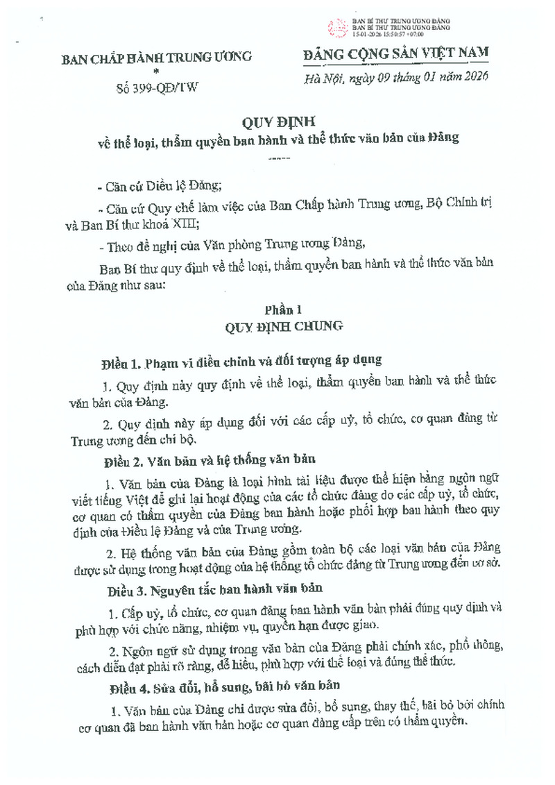 | Tiêu đề văn bản | Quy định số 399-QĐ/TW, ngày 09/01/2026 của Ban Bí thư về thể loại, thẩm quyền ban hành và thể thức văn bản của Đảng | ||