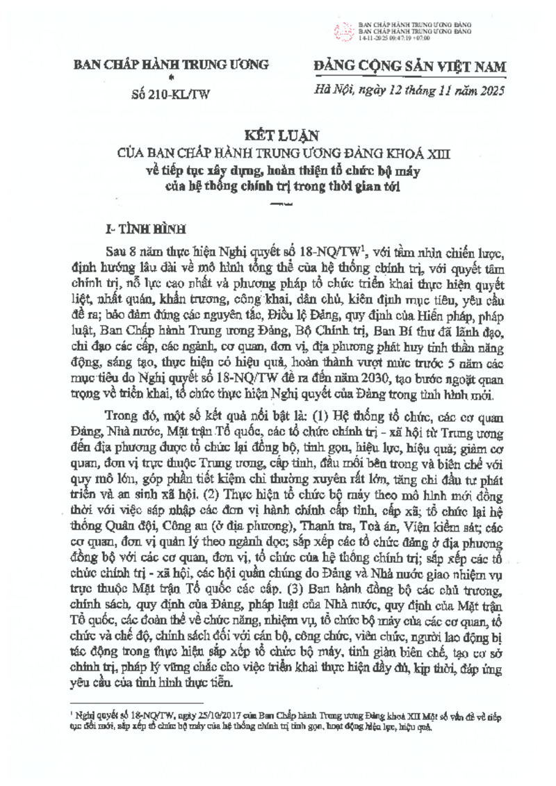 | Tiêu đề văn bản | Kết luận số 210-KL/TW ngày 12/11/2025 của Ban Chấp hành Trung ương về tiếp tục xây dựng, hoàn thiện tổ chức bộ máy của hệ thống chính trị trong thời gian tới | ||