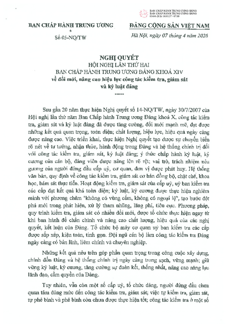 | Tiêu đề văn bản | Nghị quyết số 05-NQ/TW ngày 07/4/2026 Hội nghị lần thứ hai Ban Chấp hành Trung ương Đảng khóa XIV về đổi mới, nâng cao hiệu lực công tác kiểm tra, giám sát và kỷ luật đảng | ||
