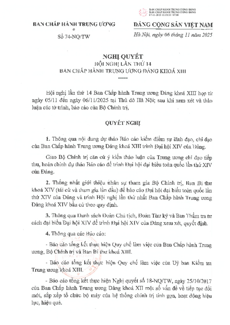 | Tiêu đề văn bản | Nghị quyết số 74-NQ/TW ngày 6/11/2025 Hội nghị lần thứ 14 Ban Chấp hành Trung ương Đảng khóa XIII | ||
