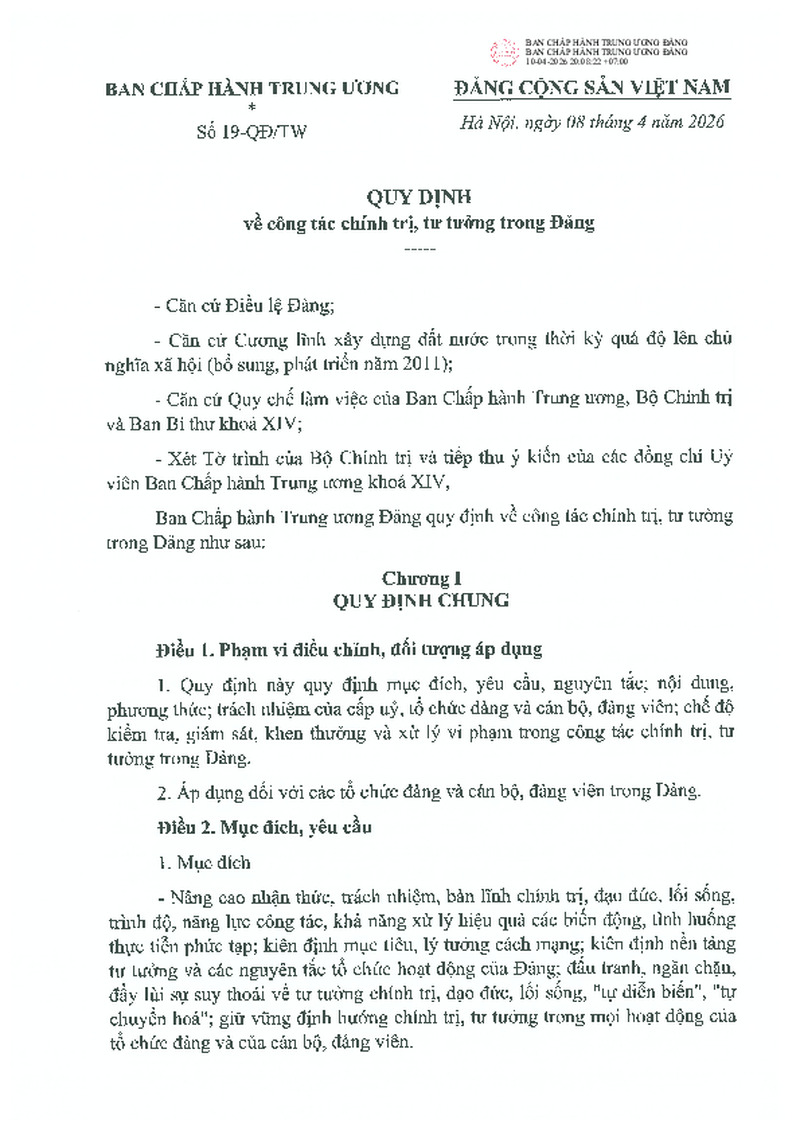 | Tiêu đề văn bản | Quy định số 19-QĐ/TW ngày 08/4/2026 của Ban Chấp hành Trung ương Đảng về công tác chính trị, tư tưởng trong Đảng | ||