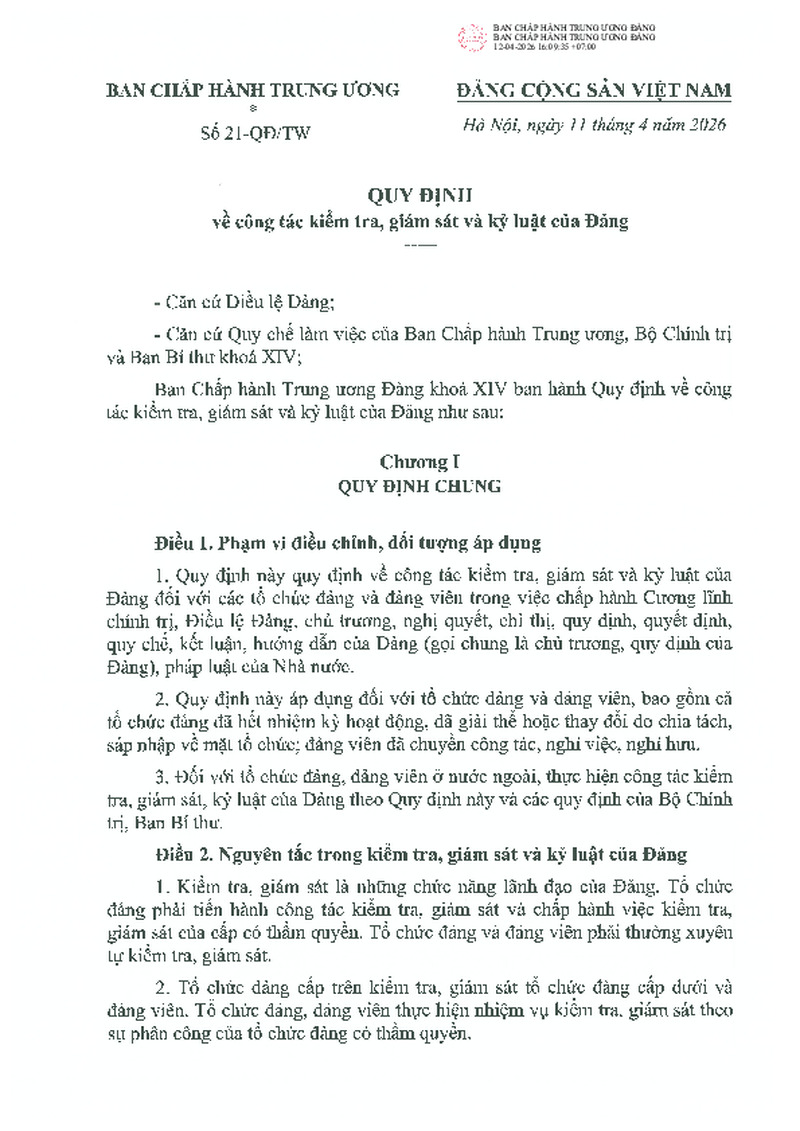 | Tiêu đề văn bản | Quy định số 21-QĐ/TW, ngày 11/4/2026 của Ban Chấp hành Trung ương Đảng về công tác kiểm tra, giám sát và kỷ luật của Đảng | ||