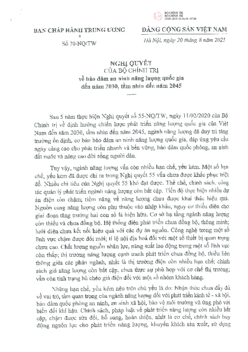 | Tiêu đề văn bản | Nghị quyết số 70-NQ/TW, ngày 20/8/2025 của Bộ Chính trị về bảo đảm an ninh năng lượng quốc gia đến năm 2030, tầm nhìn đến năm 2045 | ||