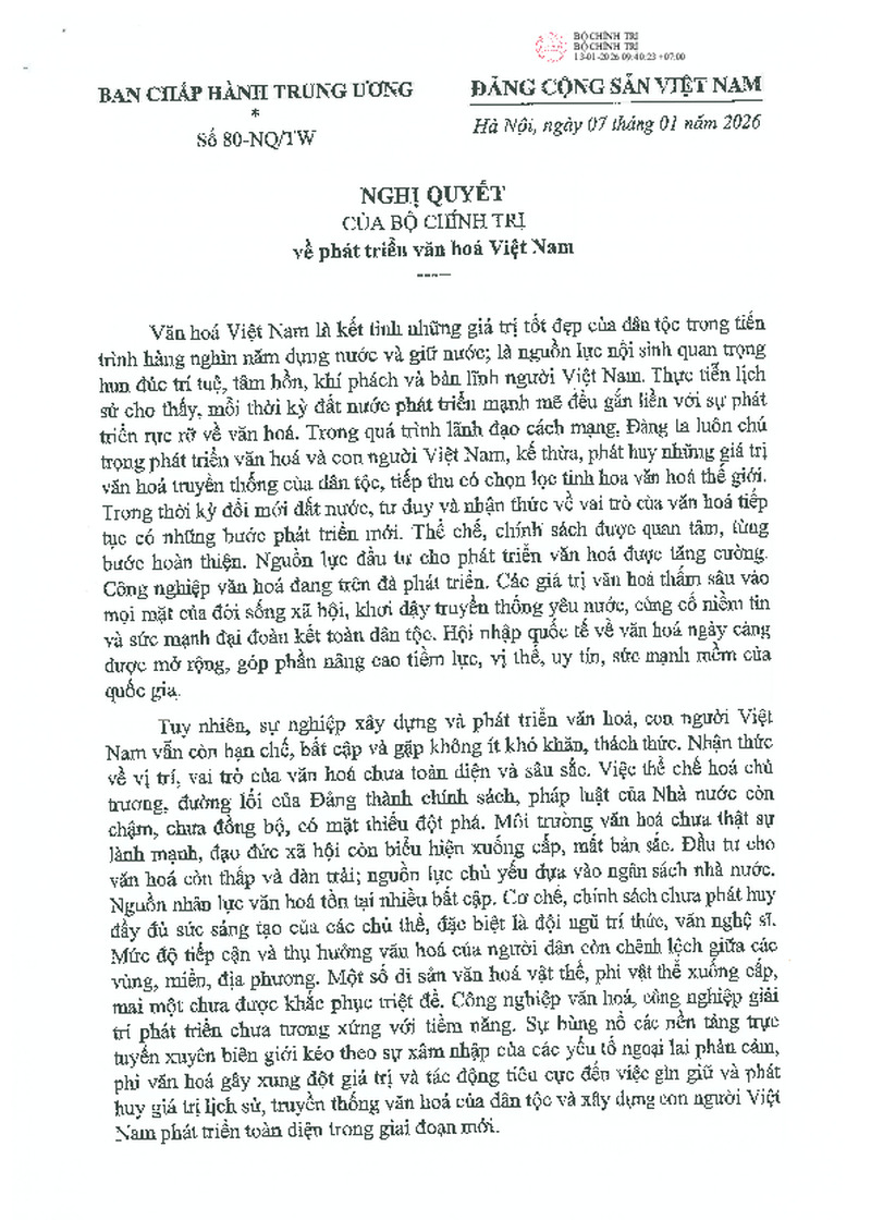 | Tiêu đề văn bản | Nghị quyết số 80-NQ/TW, ngày 07/01/2026 của Bộ Chính trị về phát triển văn hóa Việt Nam | ||